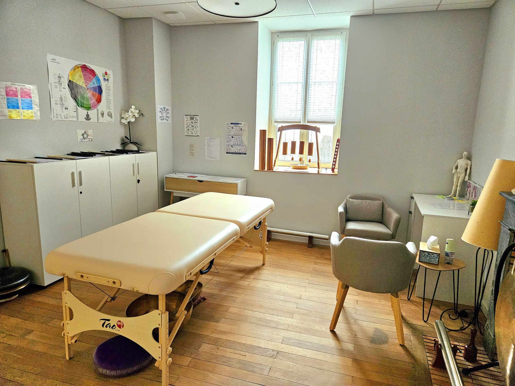 Ensuite, habillé.e et déchaussé.e, vous vous allongez sur la table de massage (ou éventuellement assis.e selon vos capacités physiques).